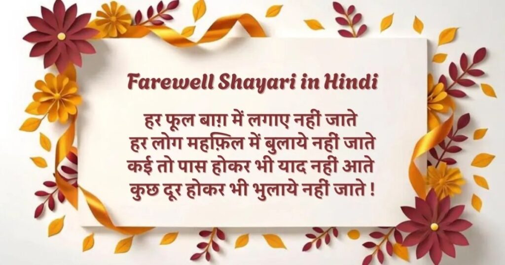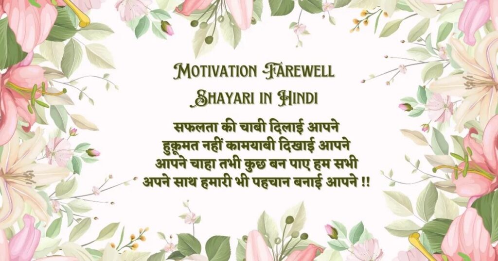 Many people search for motivation farewell shayari in hindi and student motivation farewell motivational shayari in hindi to express feelings better. Farewell motivational Shayari also includes farewell motivational shayari that inspires hope for the future. You can also find farewell motivational quotes in hindi that give strength during emotional goodbyes. In simple words, Farewell motivational Shayari is the best way to say goodbye with respect, emotion, and motivation for a new journey ahead.